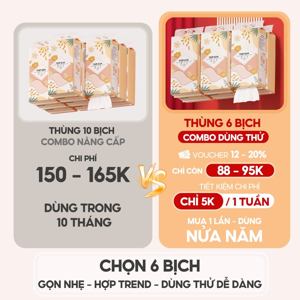 Giấy vệ sinh treo tường Top Gia thùng 6 bịch đa sắc làm từ bột giấy thiên nhiên, 1280 tờ 4 lớp dày dặn